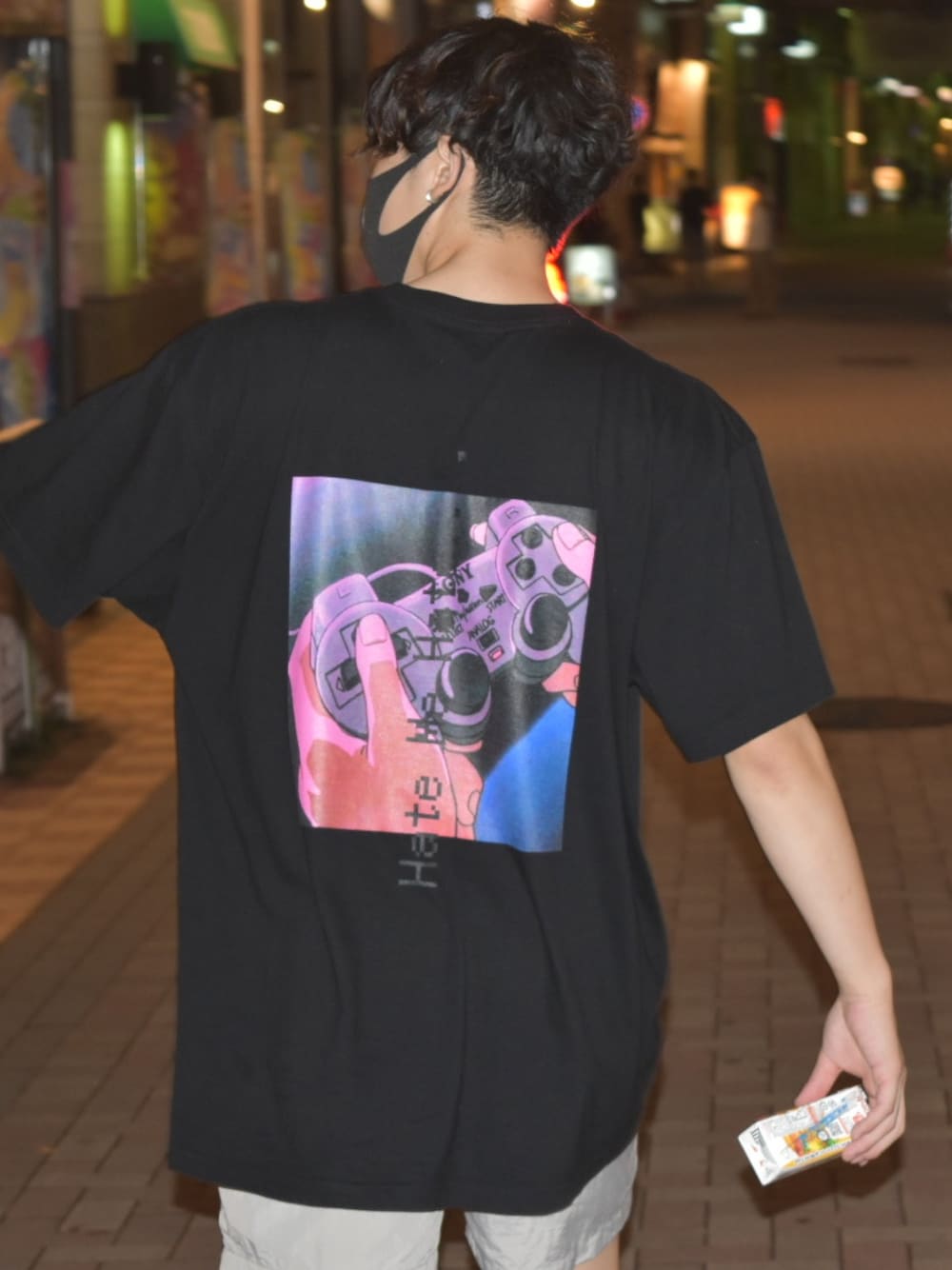 ブラック系のTシャツ/カットソーを着用したメンズの夏コーディネートの1枚目の写真