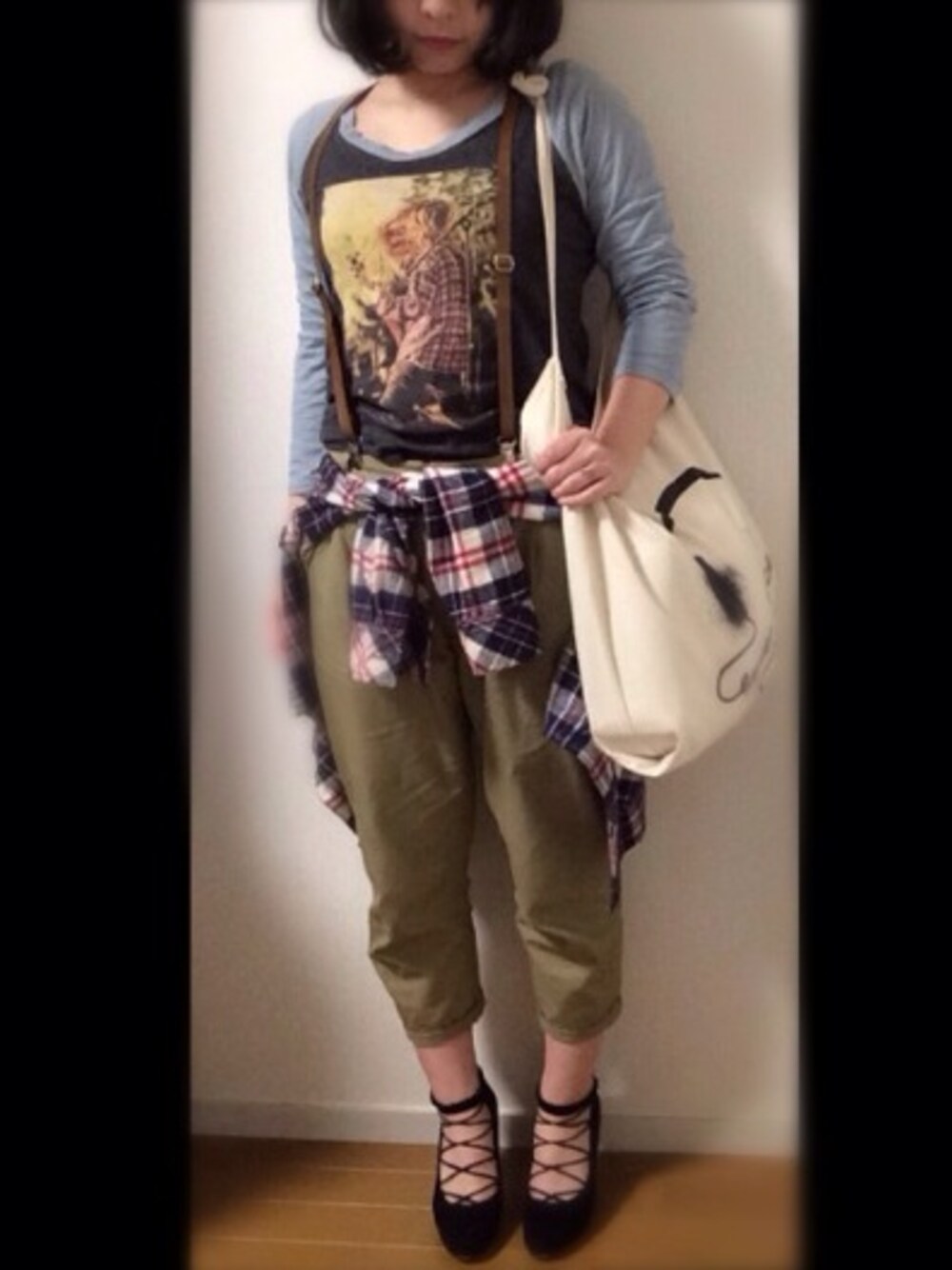 ラグランT:Kastane チェックシャツ:Kastane パンツ:Te chichi パンプス:ツモリチサト バッグ:flumpoolのライブグッズ サスペンダー:?