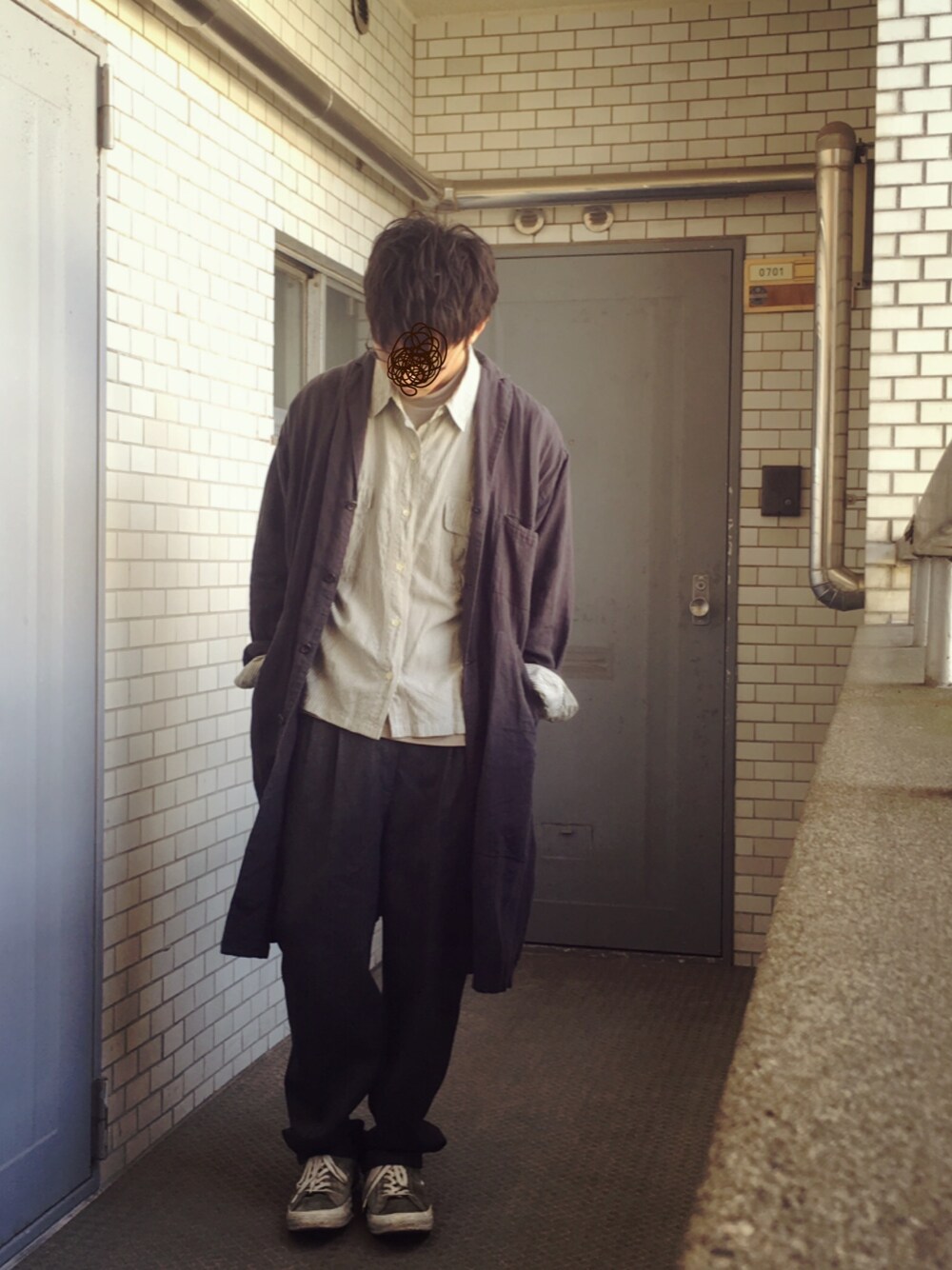 グレー系のその他アウター、グレー系のスニーカーを着用したメンズの秋コーディネートの1枚目の写真