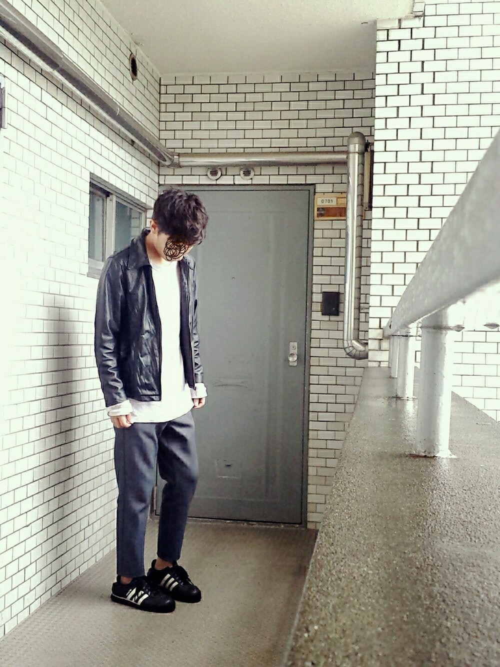 ブラック系のジャケット/アウター、ブラック系のスニーカーを着用したメンズの秋コーディネートの1枚目の写真