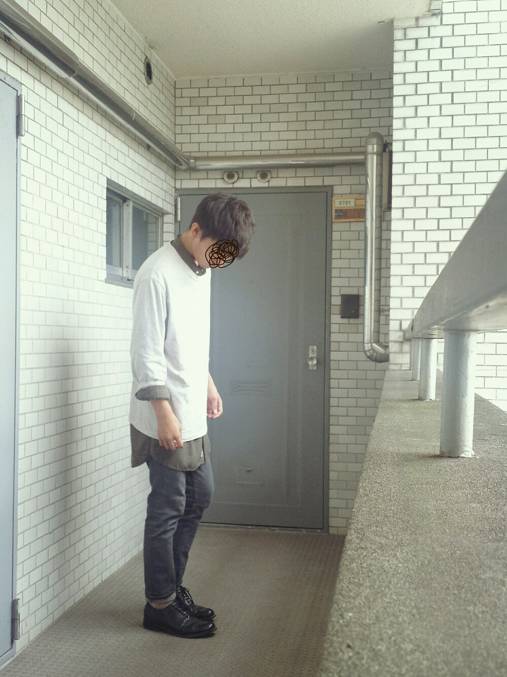 ブラック系のドレスシューズ、ホワイト系のトップスを着用したメンズの秋コーディネートの1枚目の写真