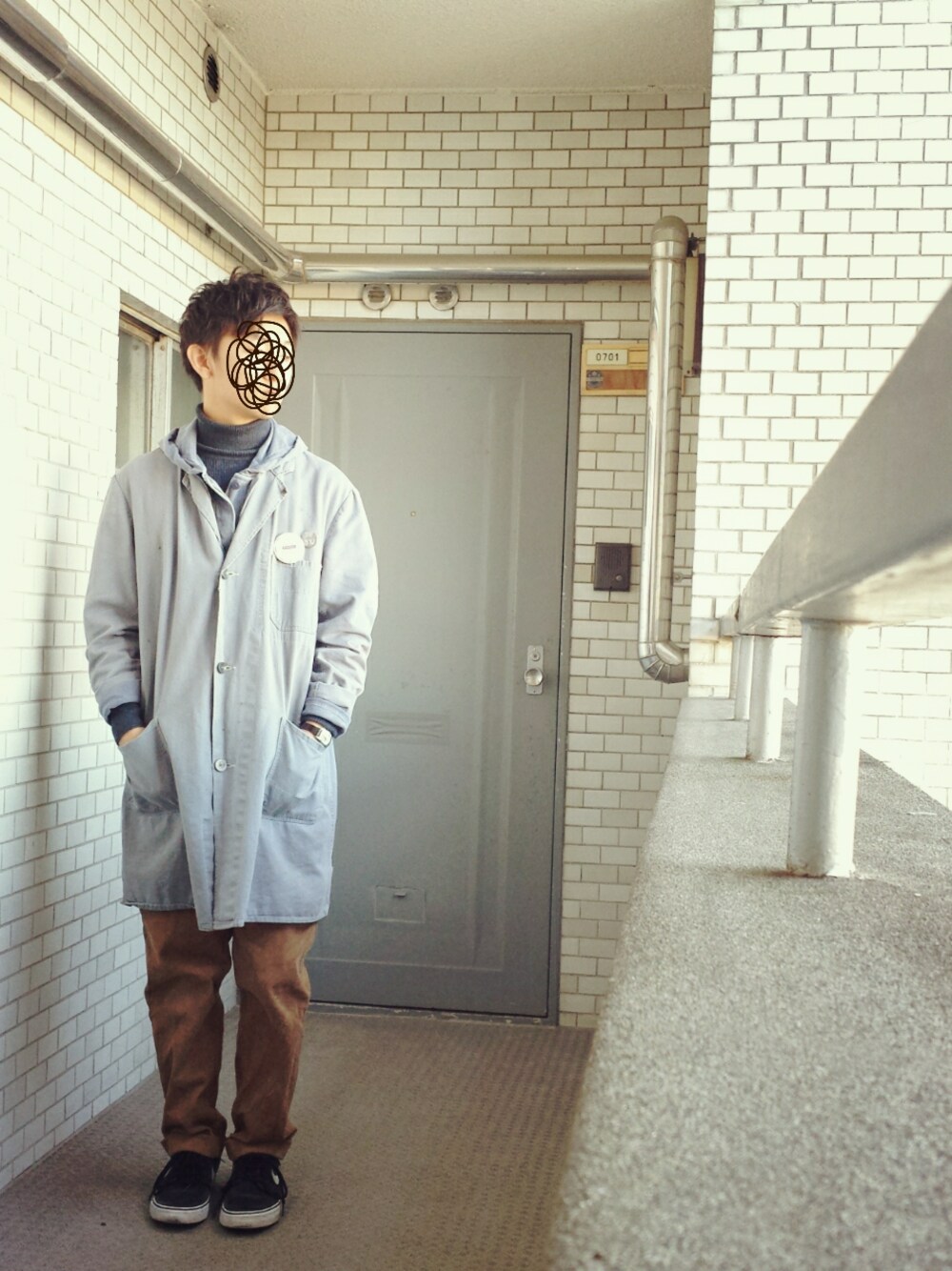 ブラック系のスニーカー、ブルー系のジャケット/アウター、ホワイト系のファッション雑貨を着用したメンズの冬コーディネートの1枚目の写真