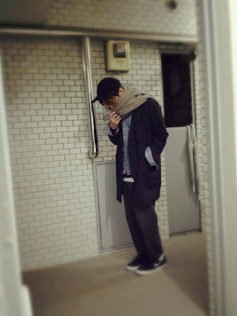 その他のトップス、ブラック系のスニーカーを着用したメンズの冬コーディネートの1枚目の写真