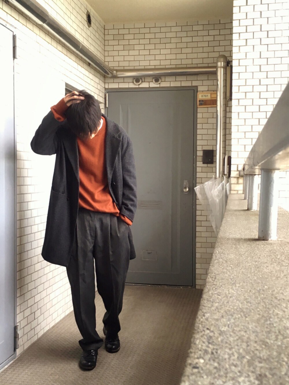 また歩き出してしまった。。 デカめのニットをタックイン。 身幅のゆるいチェスター羽織って。
