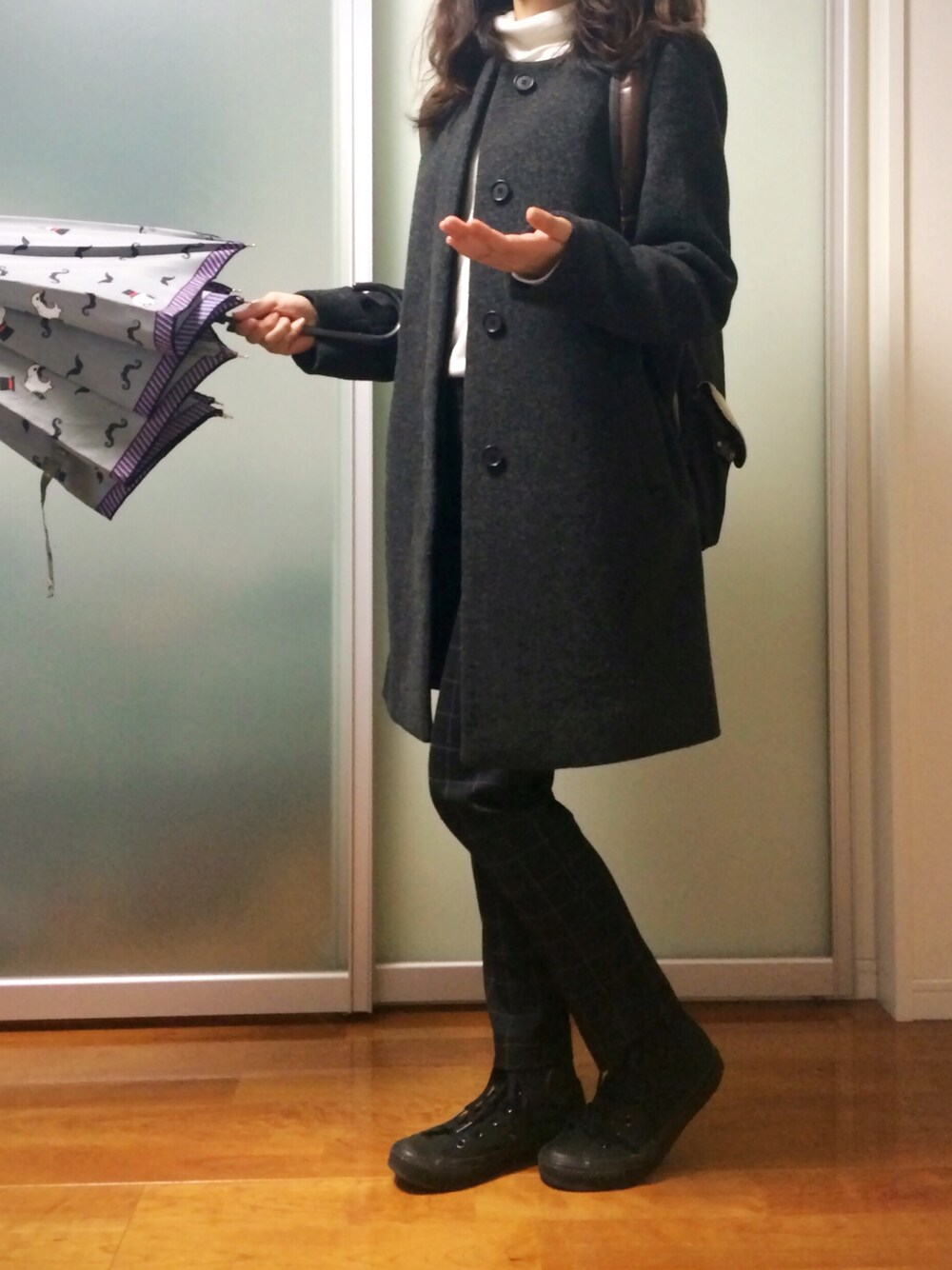 おはようございます。 生憎の雨続きですが、お気に入りの傘で気分を上げていきましょう。 傘をさすなら両手を空けたいので、リュックで。 UNIQLOだらけの本日です。