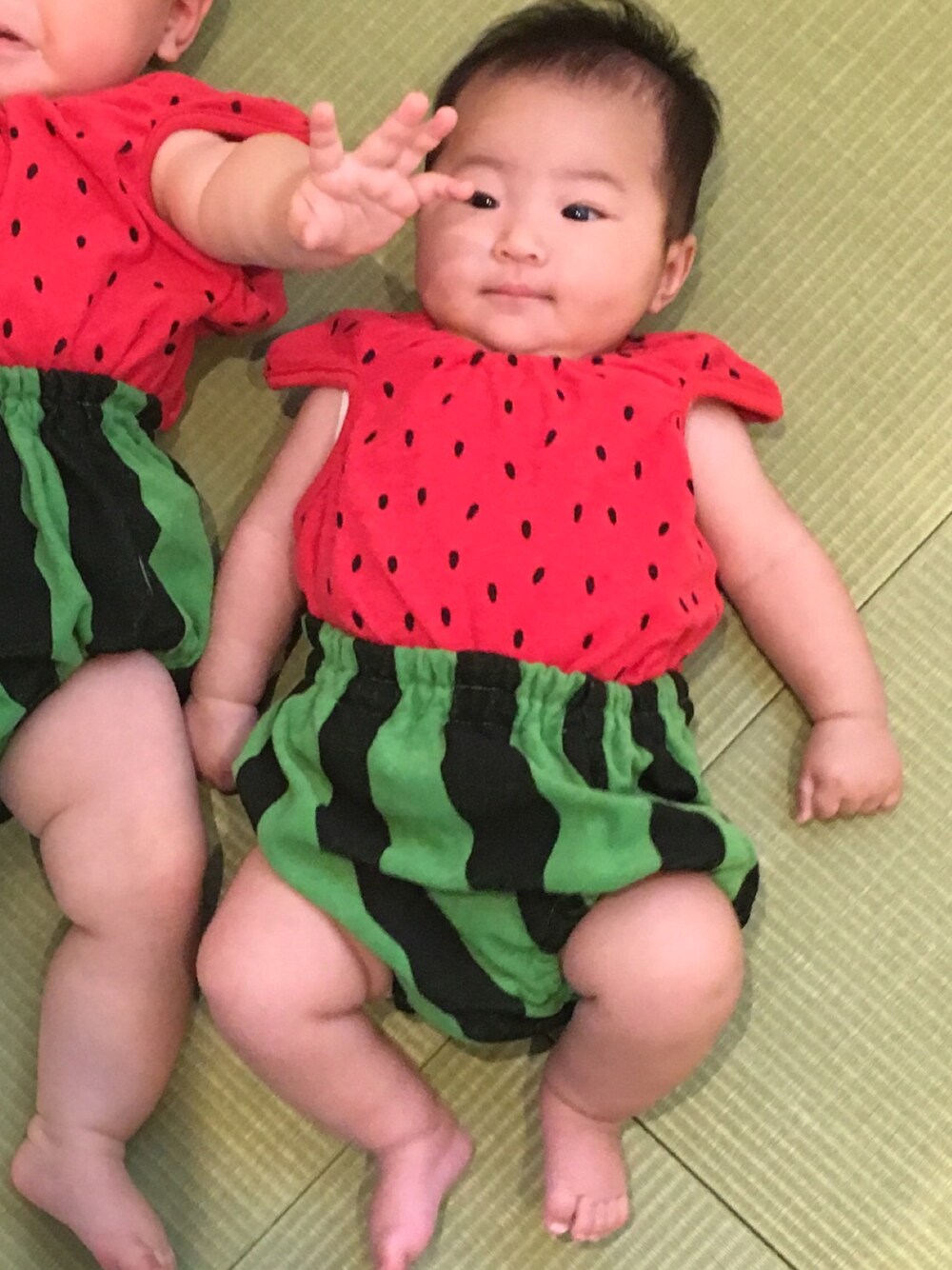 すいかちゃんコーデ🍉 友達の子どもとお揃いで着せました😊 並ぶとめちゃくちゃ可愛い😭💕 娘‥この時2ヶ月ですが、80sizeでピッタリ!BIGベイビーな我が子👶🏻