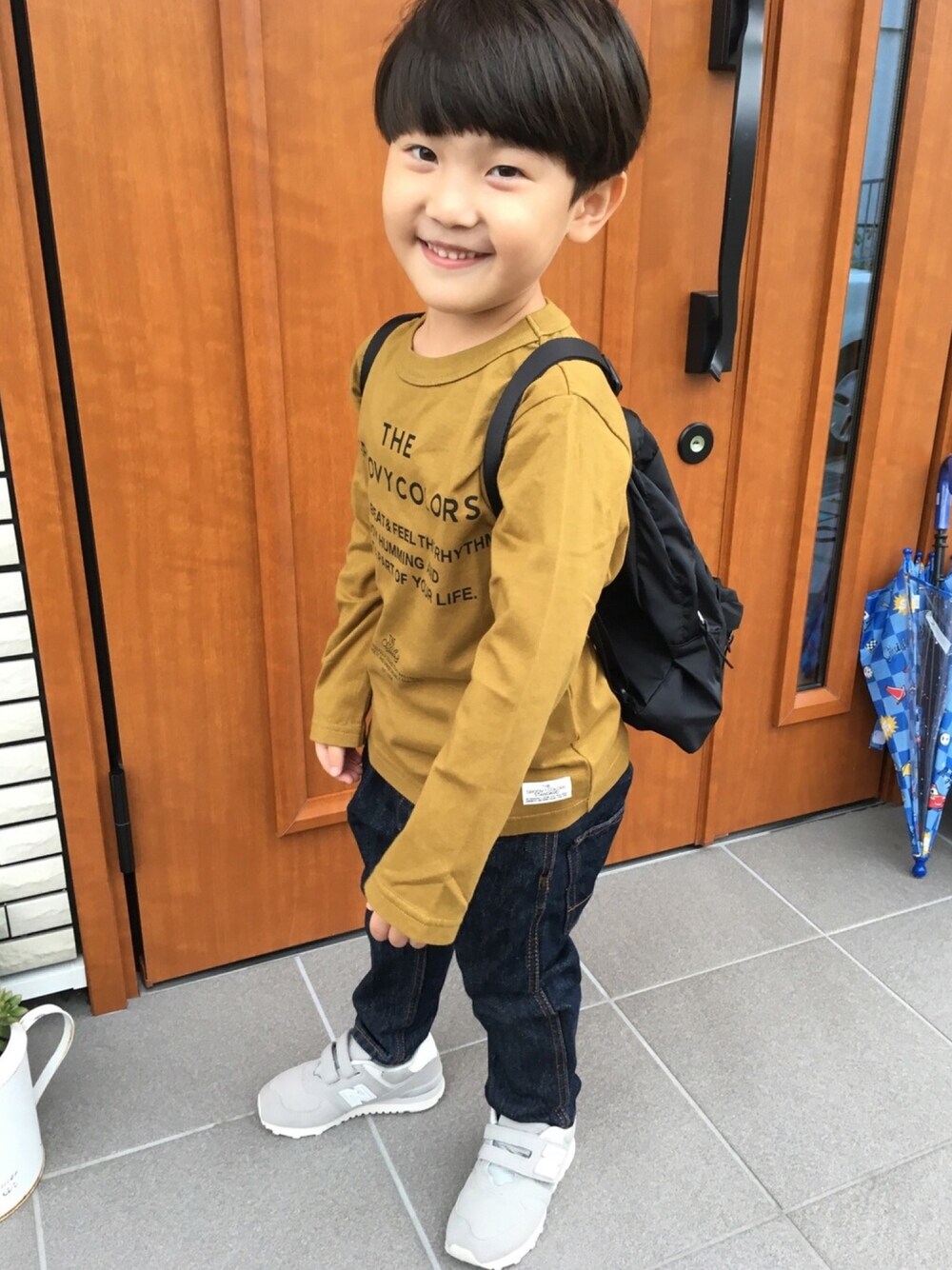 GROOVY COLORS AW新作🍁🍂 イエローなんだけど、少しカーキっぽいかな?🤔落ち着いた色味で一気に秋コーデ🧡 size大きめを買ったんやけど、首回りがしっかりしてるから120でも大丈夫そう🙆♀️💗 リュックの中身は‥‥大好きなルパパトの人形が入っています🤫