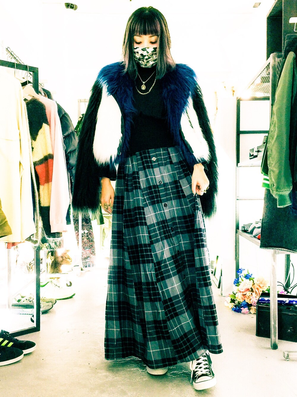 寒いからマスクが欠かせない季節だね。 outer ChaserLA inner CALMAN AND CHELOW skirt moussy kicks converse