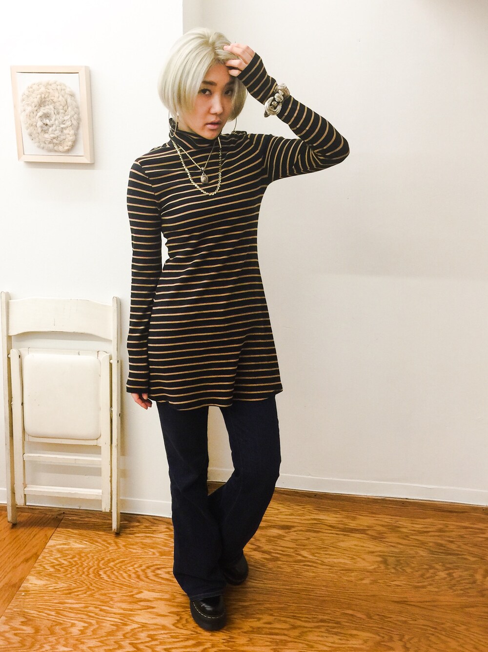 ボーダーの少しフレアのワンピースにブーツカットデニムを履くのが今の私の流行り❤️ 70'Sに着こなすのがかわいい! op UO pants BCD acc TOGA boots Dr.martens