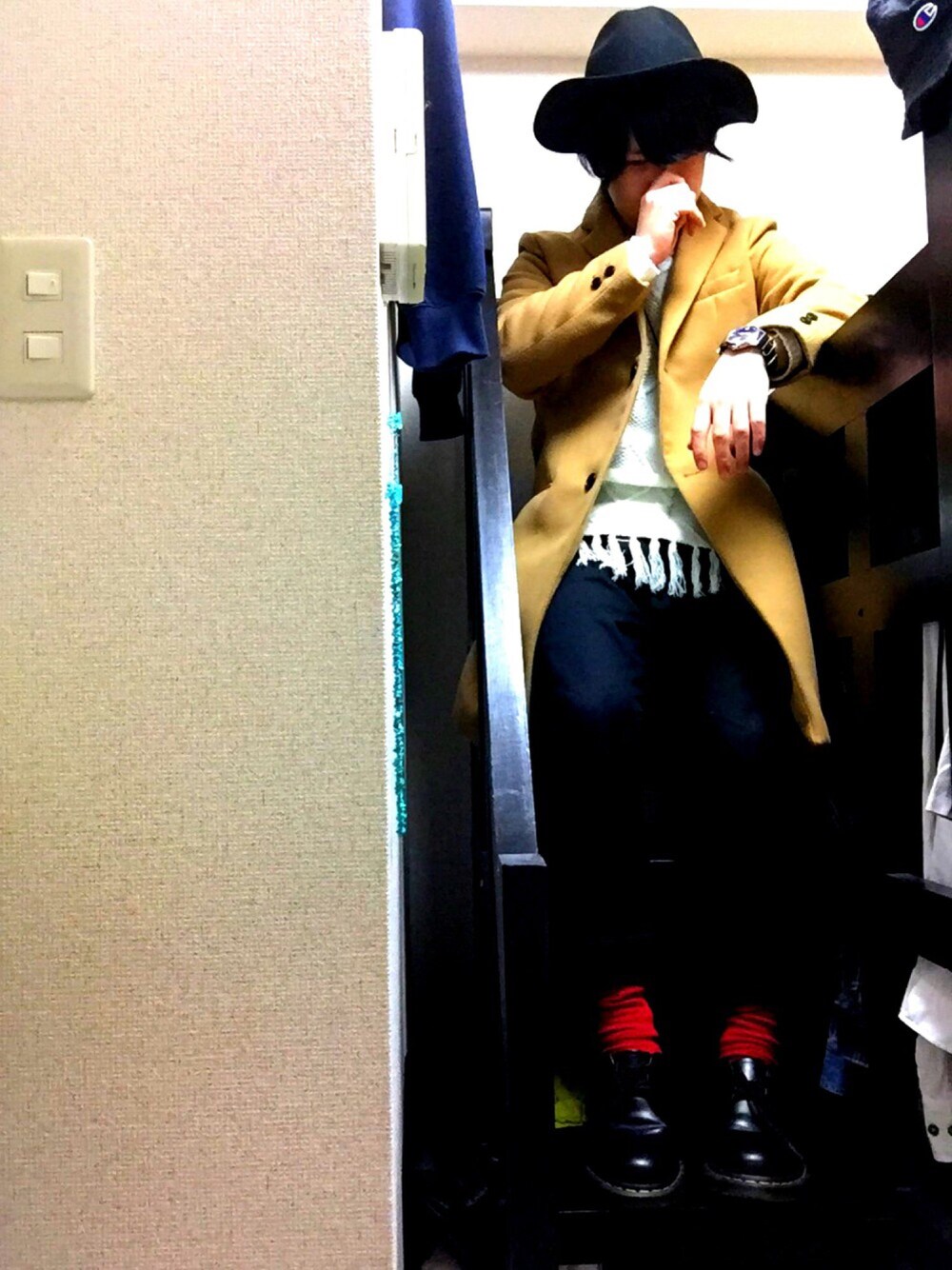 花粉症です。関東に住み始めた年から毎年この時期はひどい花粉症に見舞われます。2月から5月くらいまで、通常国会くらい続きます。鼻がつまるので鼻水のやつがタレてきても吸えないのです。負のスパイラル🐽 キャメルのチェスター着とけばいいやってやつです!赤靴下にマーチンとかも手堅く。
