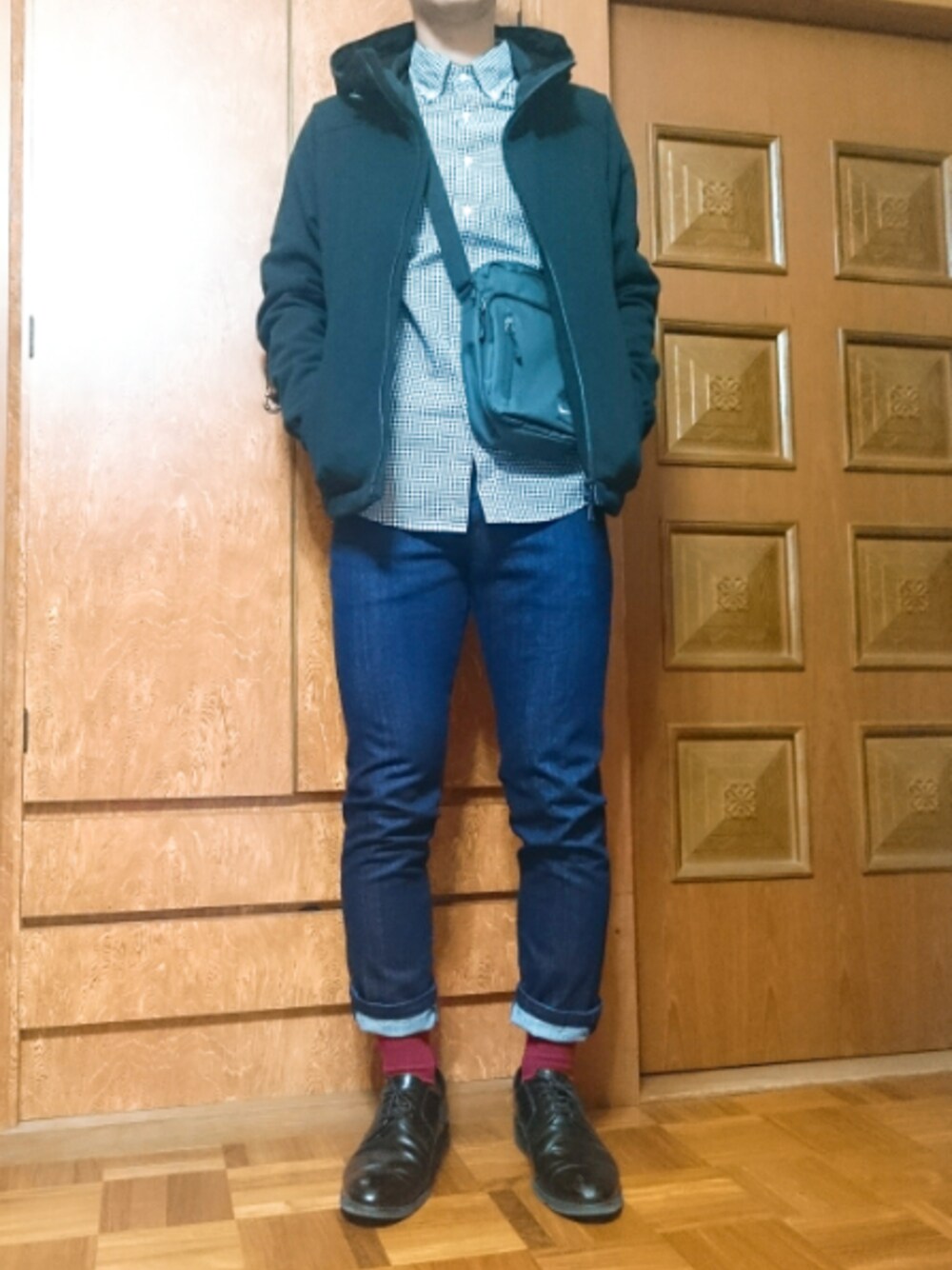 いつもお世話になっております。 NIKEのサコッシュ?便利です。 ちょうど財布とスマートフォンが入ります。 トップスはUNIQLOのギンガムチェックシャツです。