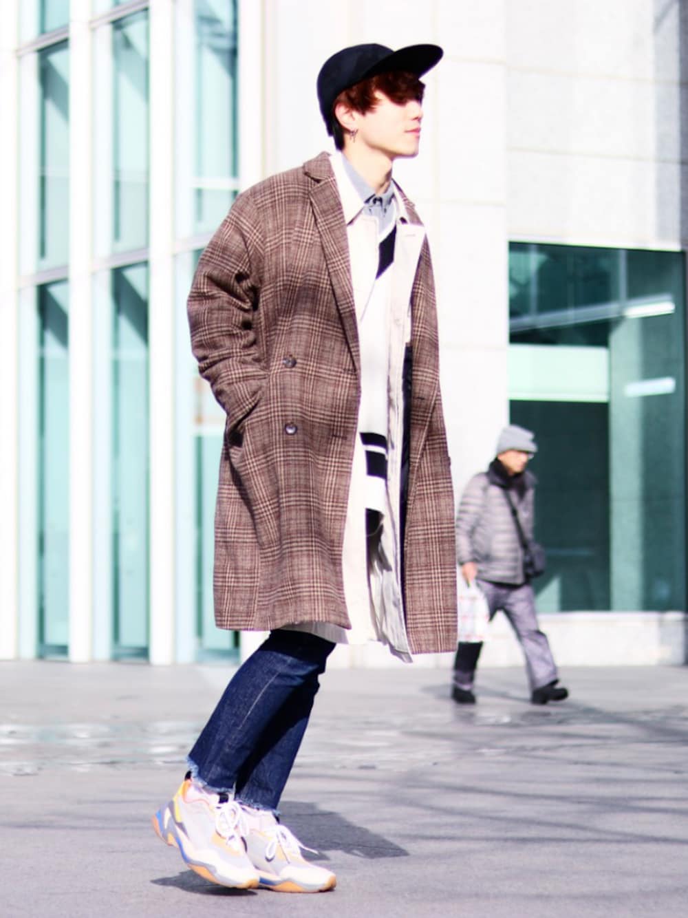 落ち着いた雰囲気を意識! こういうコーディネートにはちょい派手スニーカーをプラス🙆 ステンカラーコートの上にダブルチェスターコートを羽織って防寒&レイヤード✨ 片手にコーヒー持ってそうなコーディネートです。 普段はかぶらないキャップをかぶって上半身にボリュームを持たせました!