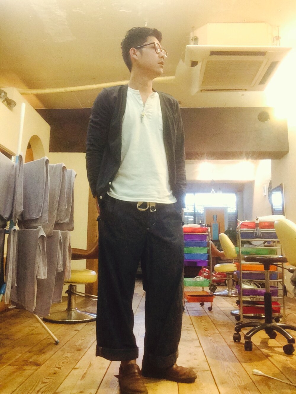 おはようです🌞なんとなくワイドなイージーパンツが履きたい今日この頃 4、5年前に買ったナイジェルケボーンのパンツ引っ張りだして履いたとさ👖 後昨日久々に弟が髪切りに来たので✂️自分の帽子被してのショット📷小窓にチラッと!笑 顔似てますかね?笑 私タイ系の顔。 弟スペイン系。