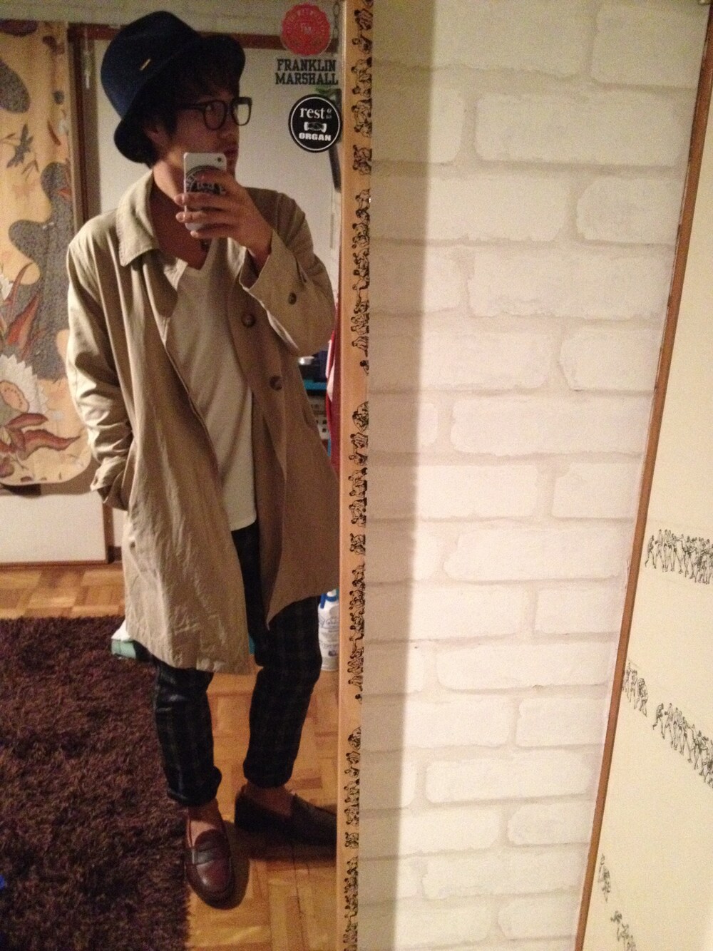 チェックパンツ✖️白T✖️トレンチ どシンプル! メガネはトムフォード!