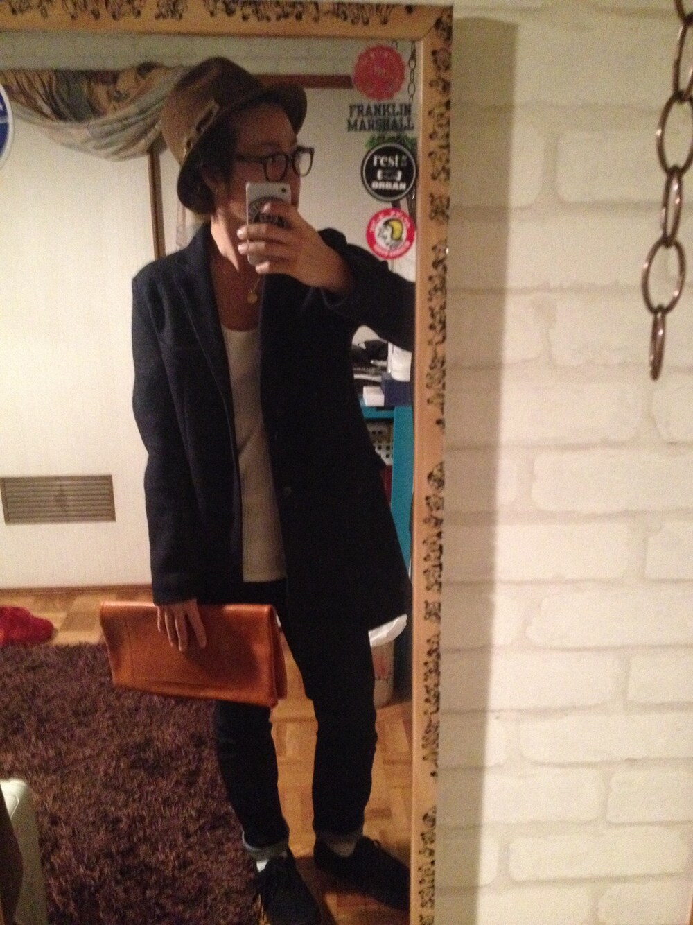 HAT:ハーツフィールド 眼鏡:トムフォード シャツ:ナノユニバース チェスターコート: 靴:VANS