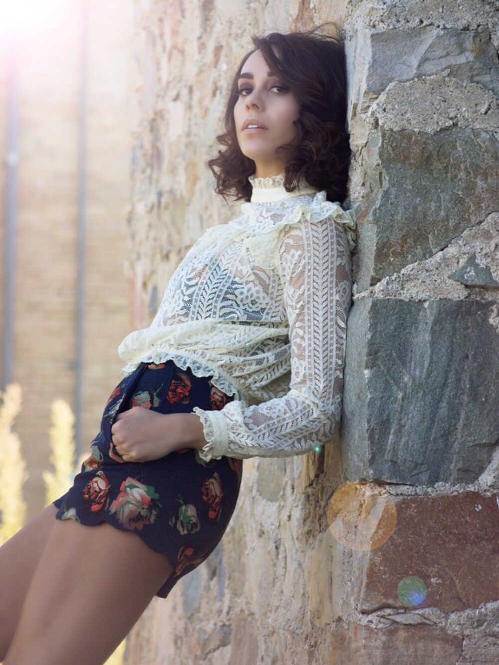 High Neck Lace Top with Floral Tapestry Shorts
