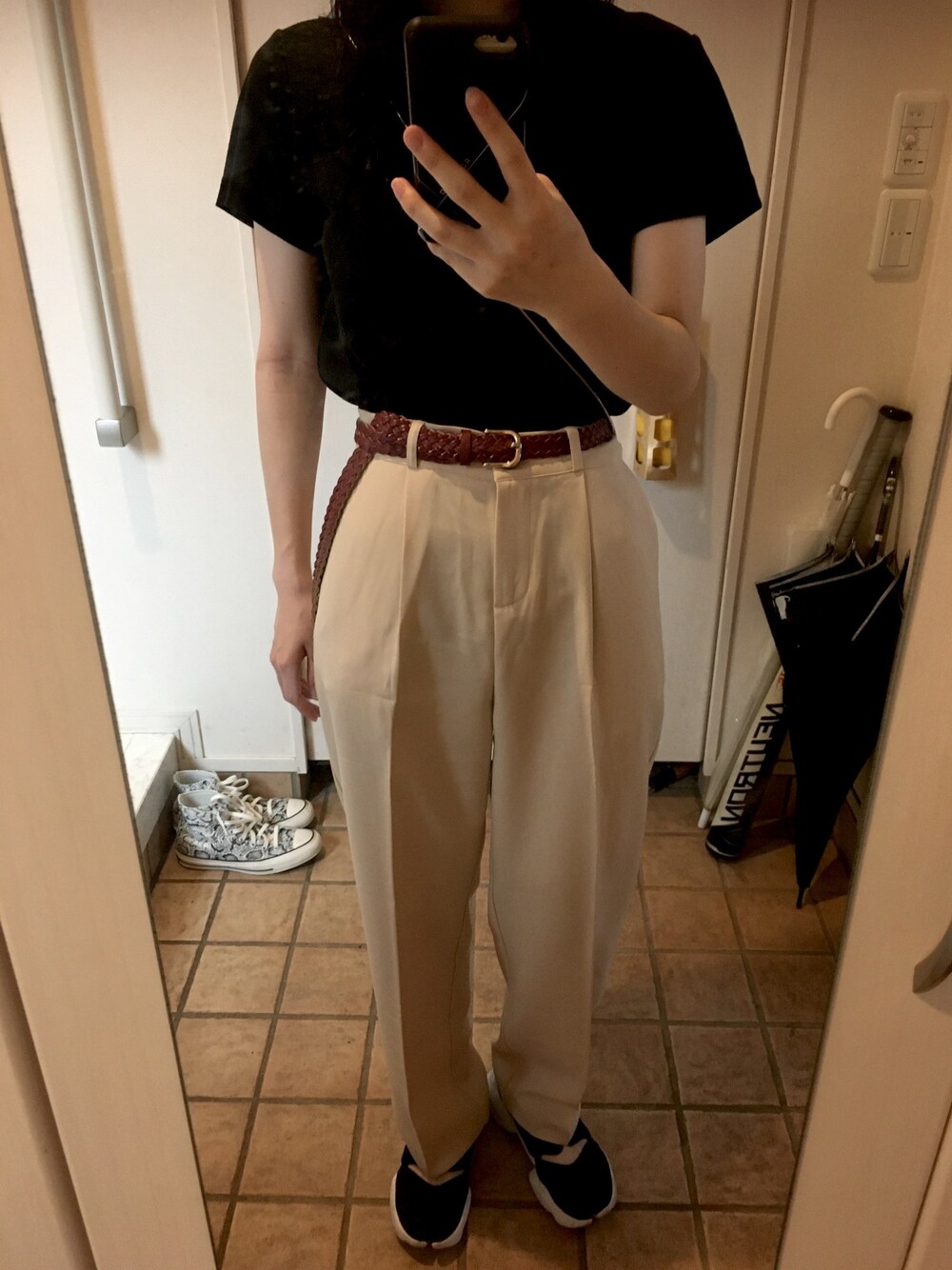 thekiのスラックス「セミワイド カラースラックス ユニセックス(ジョーゼット/ウール混の2タイプ) je-101 chw869【ベーシックライン】」を使ったコーディネート