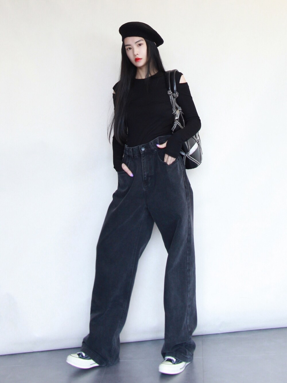 全黑搭配,肩膀部分的露肤度,让allblack变得y不那么沉闷。帽子加入后有了些复古的赶脚