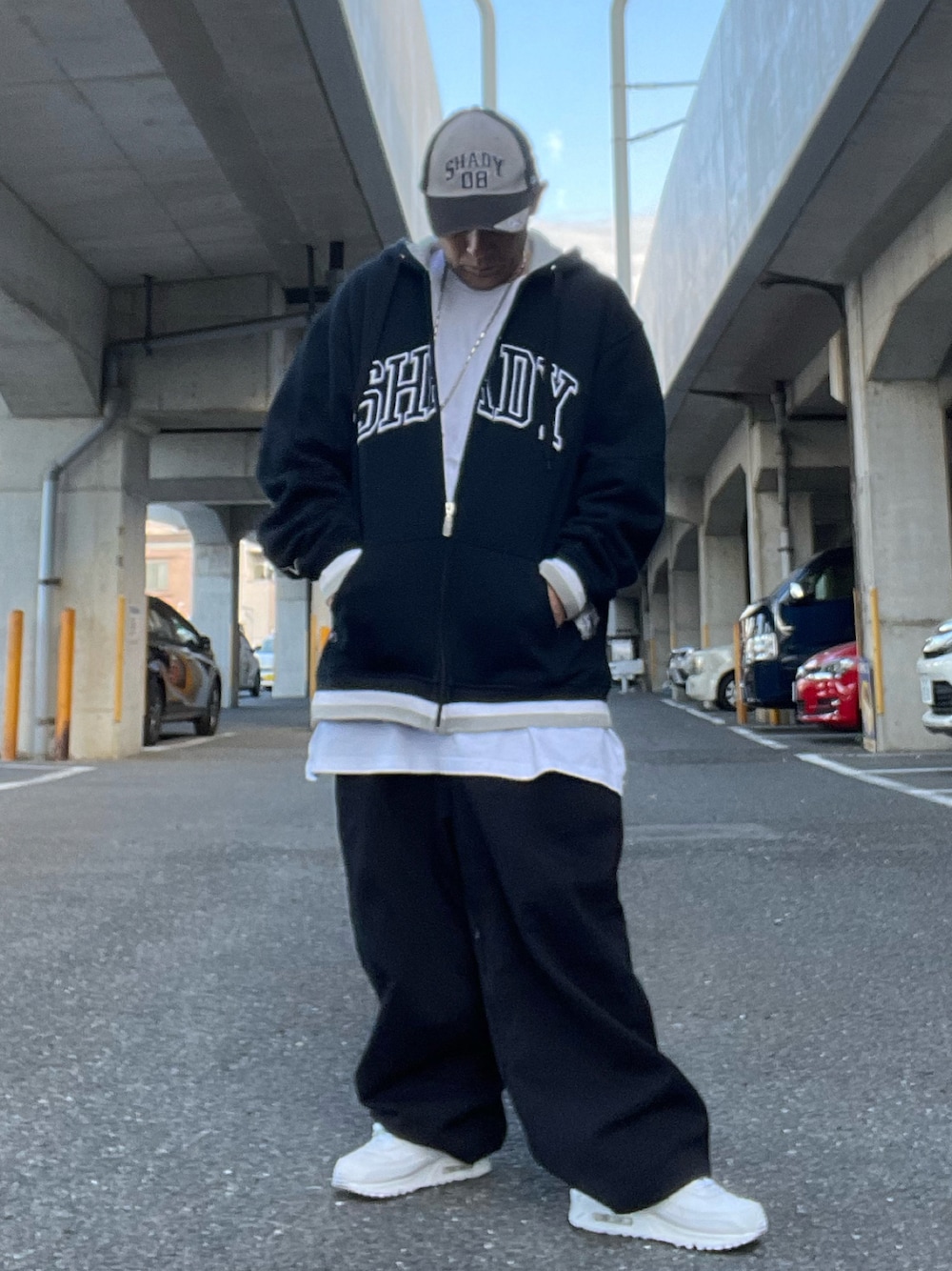 本日の龍一スタイル❣️ お江戸は 16℃という気温だったが。。。 でも。。。風が。。。強すぎるぅ🌬️ って事で エミネム、プロデュースブランド 【Shady LTD】のキャップ ジップアップパーカーを使用した 2カラーのモノトーンコーデっす。