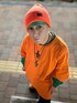 お江戸のハロウィンは 今年は、平日の為 本日がメインになるのかなぁ💦 って事で ハロウィンカラーを使用したコーデ3日目。 今回は、パンプキンカラーをイメージした🎃 オレンジ×グリーンの ニットキャップ(ビニー)スタイルより。
