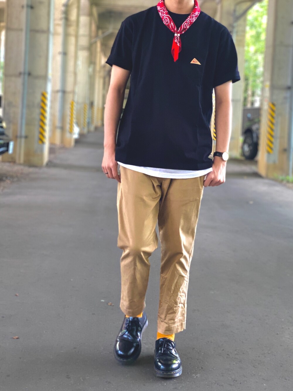 ブラック×レッド×ベージュ Tシャツを使って 落ち着きのあるカジュアルコーデ 考えてみました🇩🇪 Tシャツのレイヤード・ チノパンツでカジュアルな分 マーチンでバランスをとりました❗️ マスタード色のソックスを アクセントにしてます🟡 ・着用サイズ・ T-shirt M Inner L Bottoms M