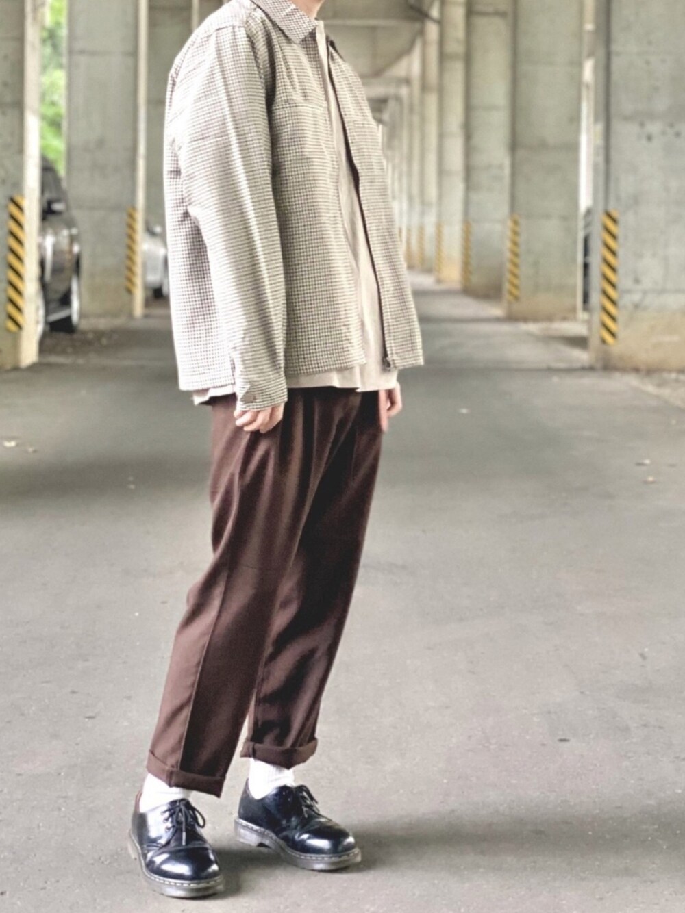 ブラウン×グレー×ブラック 本日投稿のミルクティーコーデの アレンジ。考えてみました🐶🐶🐶 チェックのブルゾンを合わせても 色合いにまとまりがあり キレイめカジュアルが 引き立ちますね✨✨ オーパサイズのアウターとの 相性が抜群です🙆♂️🙆♂️ ・着用サイズ・ Outer M T-shirt M Bottoms M Shoes 8