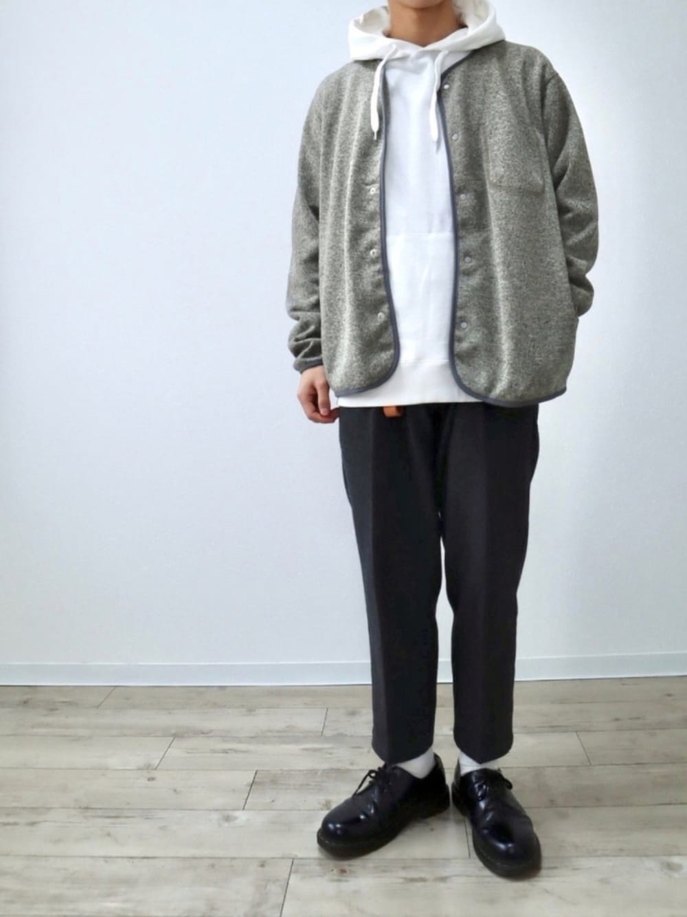 グレー×ホワイト×ブラック "フリース素材"のカーディガンと パーカーを使った ゆったりレイヤードコーデ。 考えてみました🕊🕊🕊 全体的な色味を落ち着かせ、 一見シンプルながらも、 カチオン加工の施してあるカーディガンと センタープレスの入ったボトムスで 大人っぽさを演出してます🙆♂️🙆♂️ トップスは、ゆったりめのサイズ感で まとめ、ボトムスはその分ジャストサイズ寄りにすることでバランスをとりました✨✨ シンプルなだけでなく、 着回し・アレンジが効きやすいコーディネートなので、オススメです☺️ ・着用サイズ・ Cardigan S Hoodie L Bottoms S Shoes 8