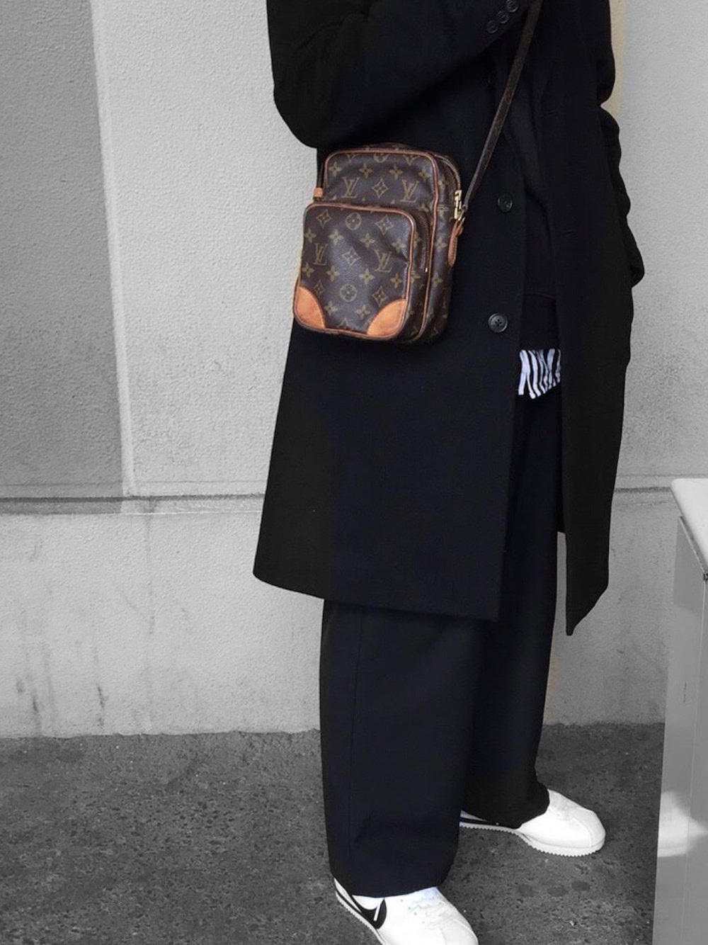 ブラウン系のボディバッグ/ウエストポーチを着用したメンズの秋コーディネートの1枚目の写真