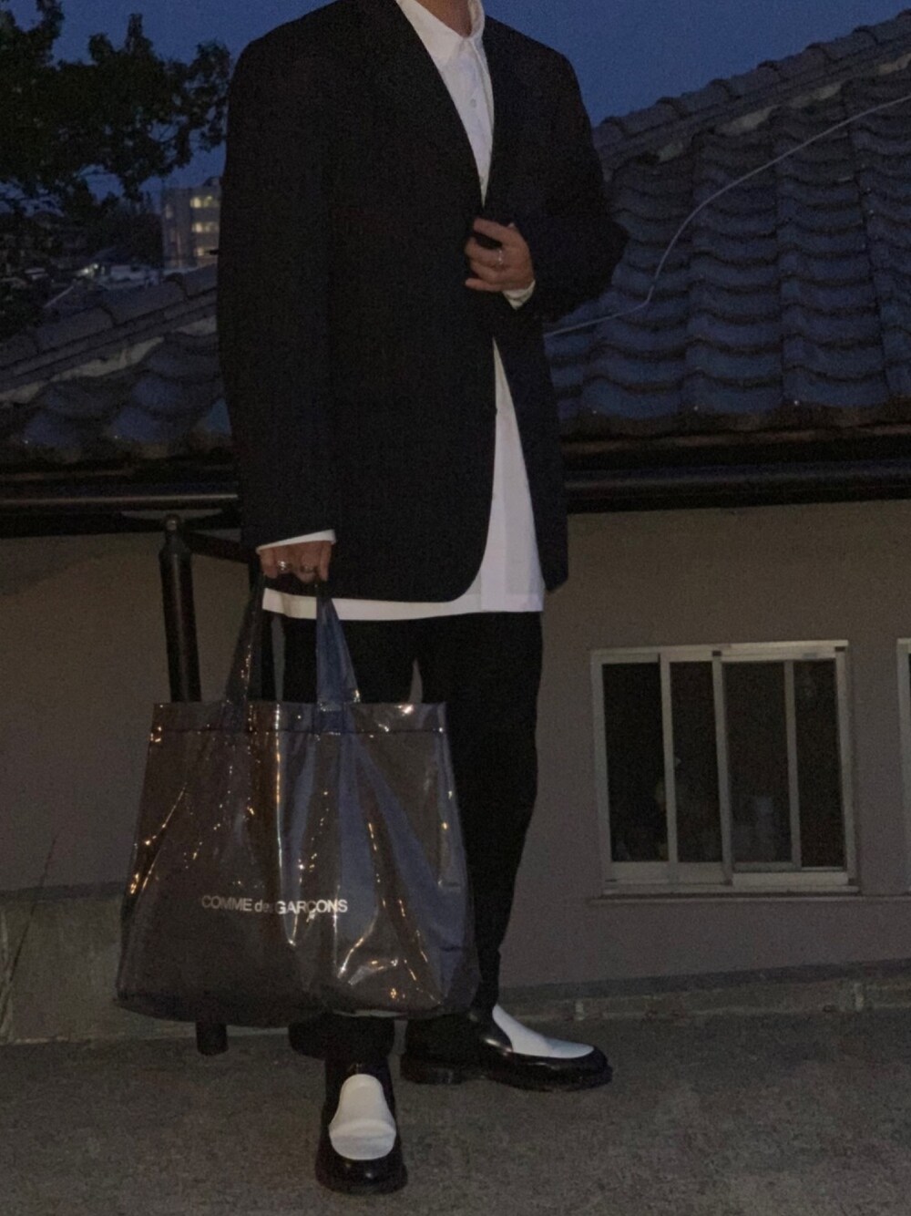 ブラック系のテーラードジャケットを着用したメンズの春コーディネートの1枚目の写真