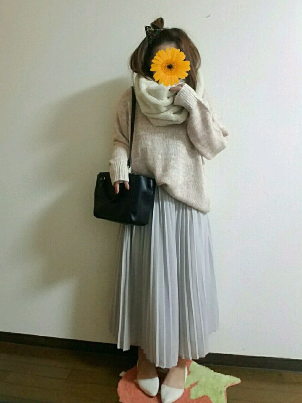 お友達のおうちに 車で行くのでアウターなし(*´꒳`*) ヘザーのニットは今季会員限定セールで1800円 GUのショルダーバッグ990円 ハニーズのプリーツスカンツは1500円 ディスコートのスヌードはお正月70%OFFで1000円 我ながら改めて お買い物上手です(*´-`)笑