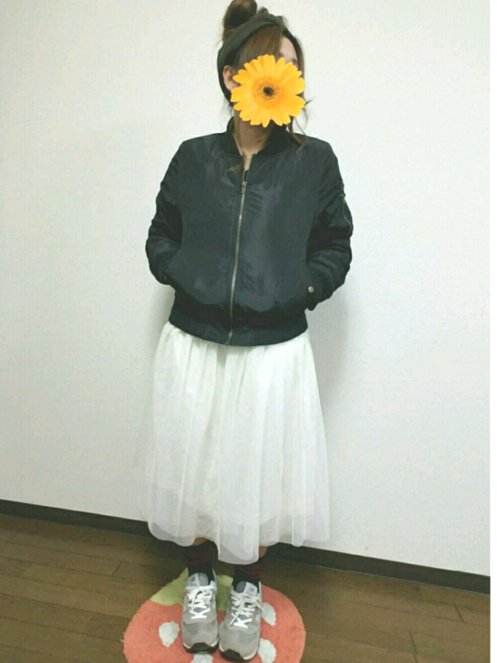 お気に入りのしまむらのMA-1(*´꒳`*) earthのタイムセールで 1400円くらいで買った チュールスカート♡ 基本的に衣替えしません(*´꒳`*)笑 年中お気に入りは着ています♡