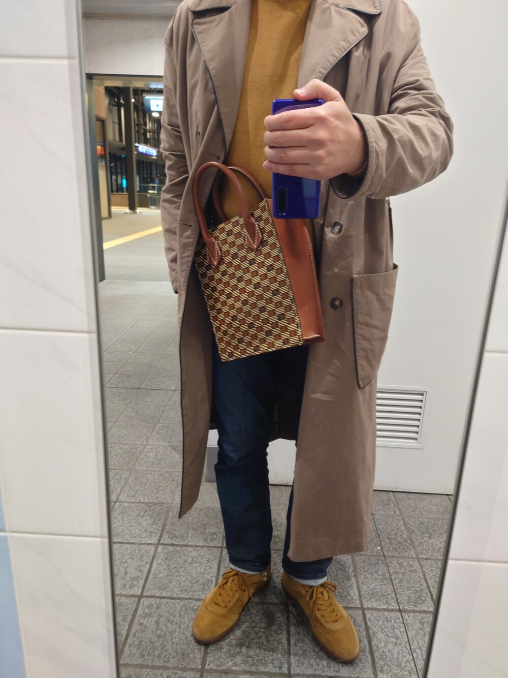 ベージュ系のトレンチコートを着用したメンズの春コーディネートの1枚目の写真