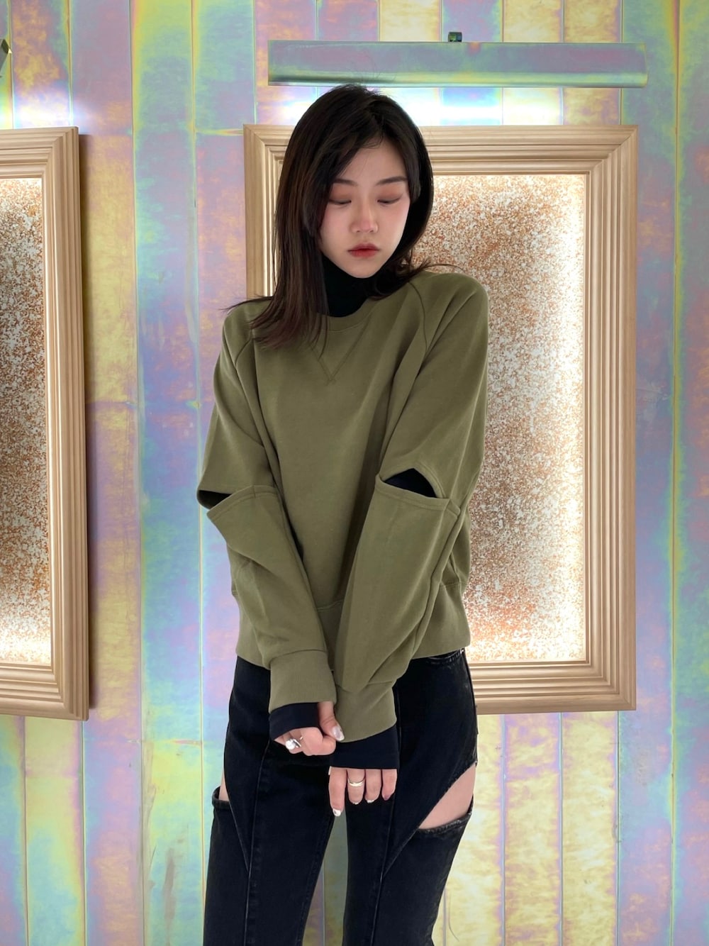 スリットが施されたスウェットはトレンド感をプラスできる優れもの。 ややゆったりとオーバーなシルエットです。 中に薄手のカットソーを入れてレイヤードスタイルに仕上げました◎