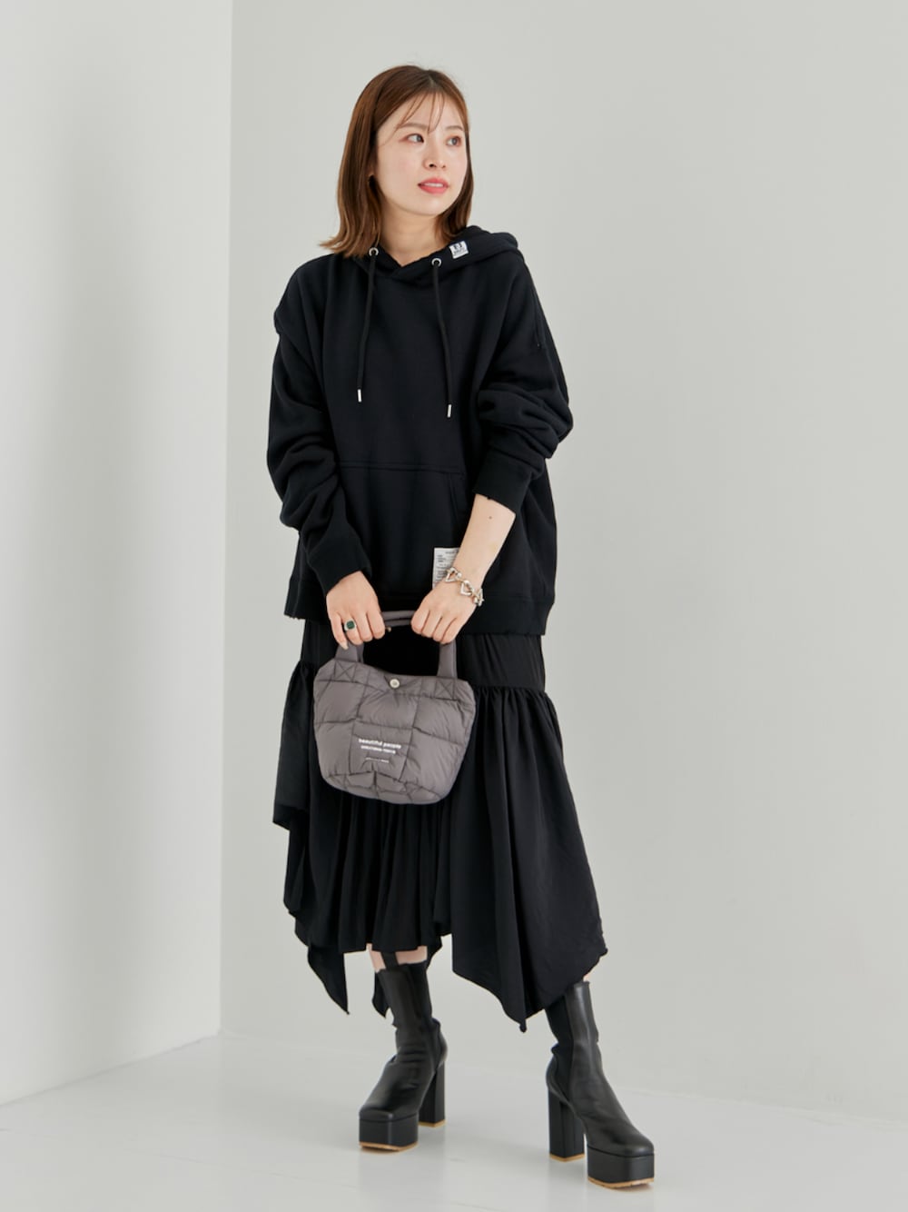 THE TOKYO STAFF(THE TOKYO)のショルダーバッグ「《残りわずか》【beautiful people/ビューティフルピープル】別注 PATTED MINI TOTE SHOULDER BAG/パデッドミニトートショルダーバッグ/ナイロン巾着バッグ/キルティングギャザーバッグ/防水」を使ったコーディネート