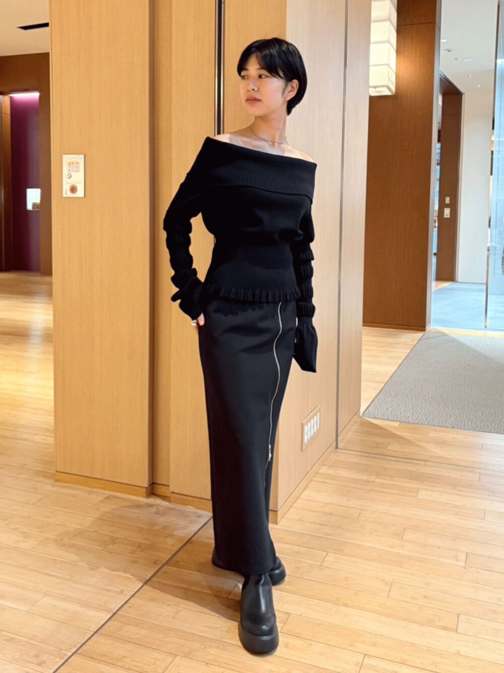 THE TOKYO STAFF(THE TOKYO)のニット/セーター「【FETICO/フェティコ】別注 STRIPE KNIT OFF-SHOULDER TOP/ストライプニットオフショルダートップ/リブニットオフショルダー」を使ったコーディネート