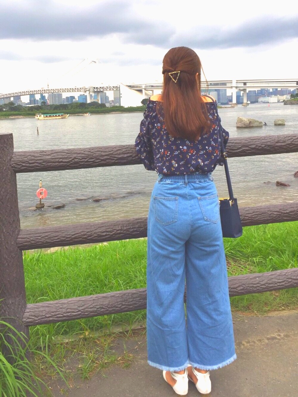 こんばんは✨ 昨日のコーデです\(^o^)/ オフショルダーがお気に入りです💗 ハイウエストワイドパンツで脚長効果を😊 後ろ姿ですみません😭
