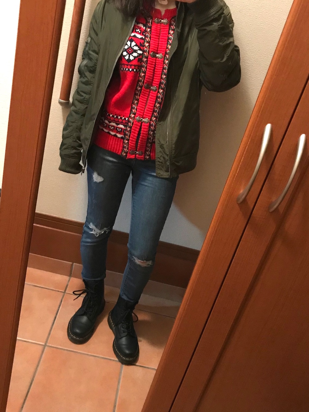 赤のセーターをアクセントにしたつもりです!!😳 そろそろ違った系統のコーディネートもしてみようかな…
