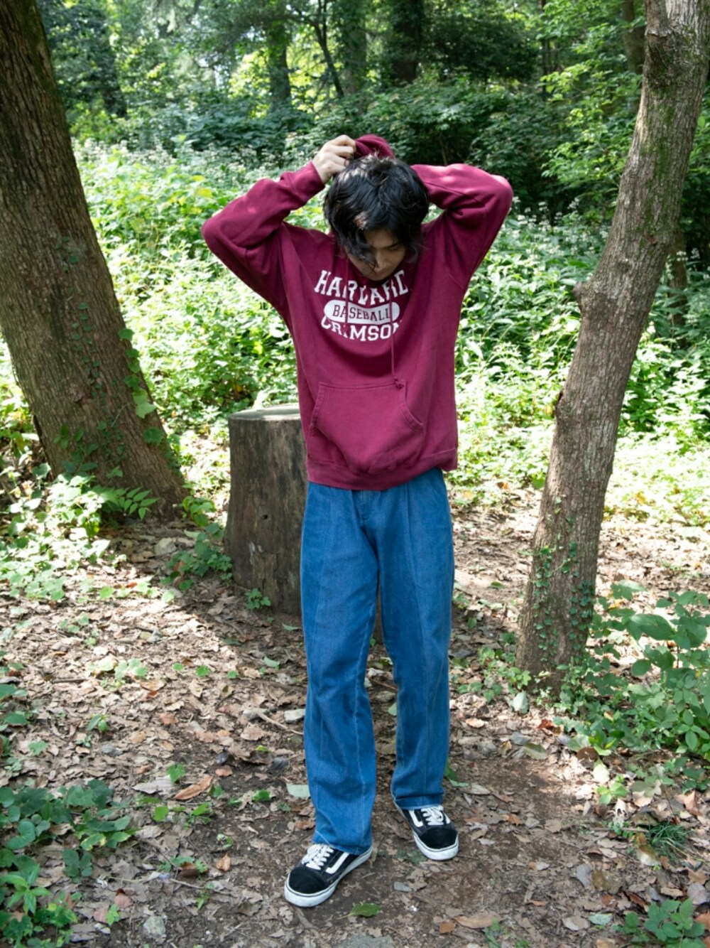 カレッジロゴパーカーは古着の王道ですね。 エンジってところもアメカジ感バツグン。 ベージュのチノパンでもいいと思う。