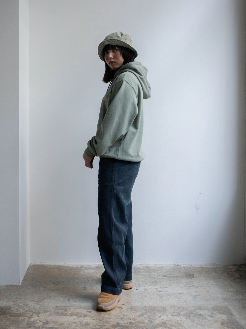 165cm Overdyed E/T-Logo Bucket Hat / Washed Green / M T-Logo LT Hoodie / Light Olive / S OL Overdyed Pant / Washed Navy / S