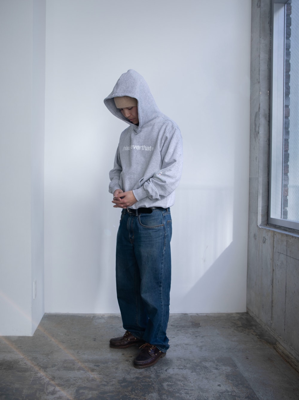 170cm Debossed No Cuff Beanie / Beige / F T-Logo LT Hoodie / Heather Grey / S Regular Jeans / Blue / M