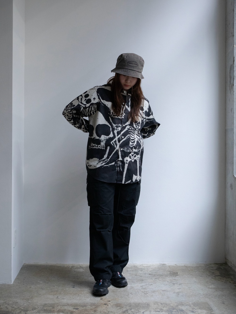 165cm Overdyed E/T-Logo Bucket Hat / Charcoal / M Skeletons Shirt / Black / M Cargo Pant / Black / M