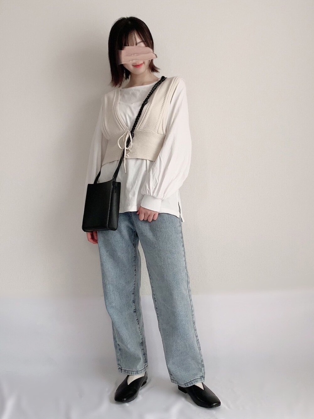 見てくださりありがとうございます☁*° GUのニットビスチェを使ったカジュアルコーデꕤ*.゚ ニットビスチェにリボンが付いているのでシンプルコーデのポイントになります🙆♀️