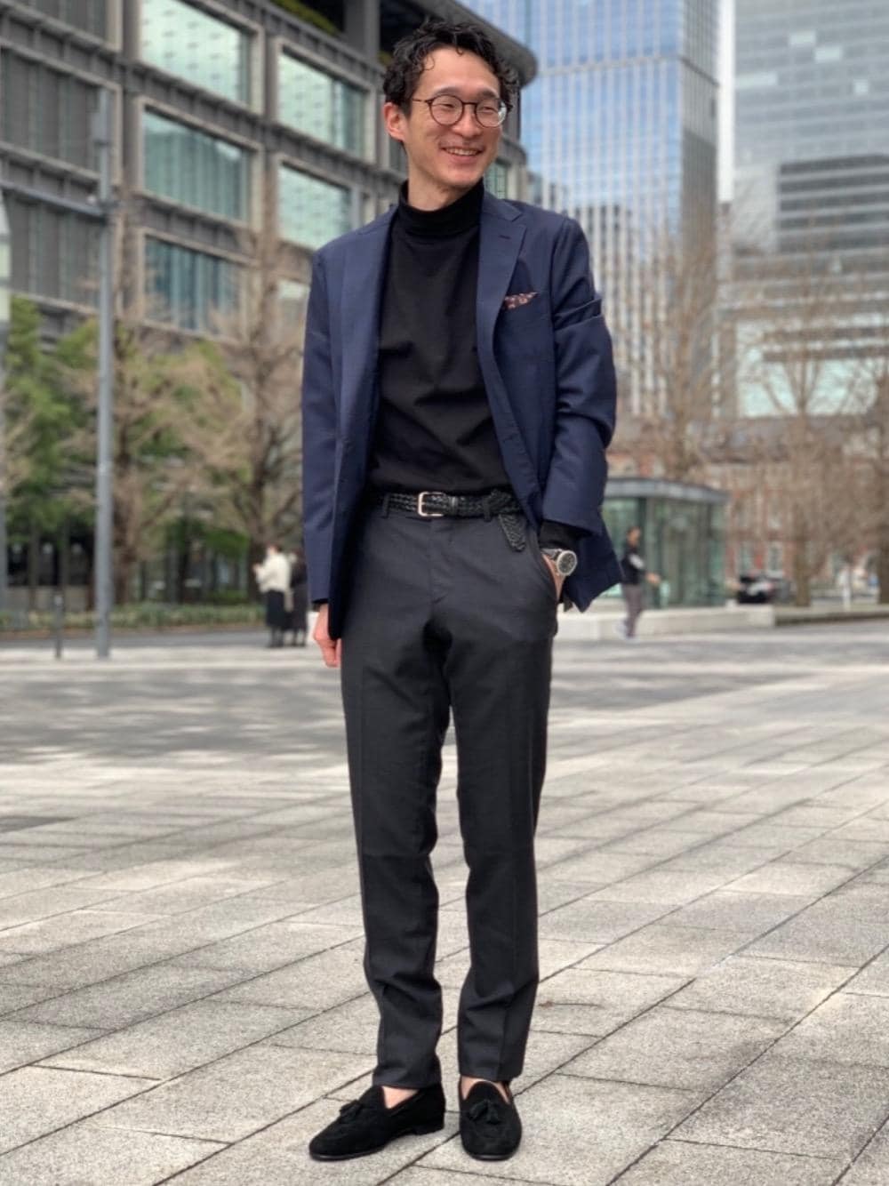 【身長】171cm【size】ジャケット 44・カットソー S・パンツ S・シューズ 40 チェックのネイビージャケットにウールスラックスを合わせたベーシックコーデ インナーをカットソーのタートルネックにすることで春夏らしい軽い印象に。 全体をモノトーン調で合わせると今っぽい感じがするかと思います。