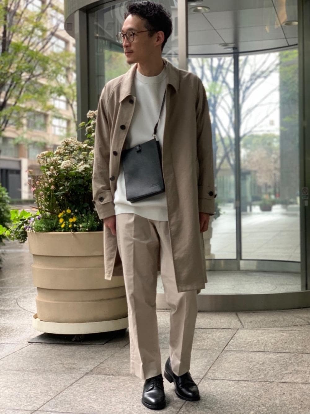【身長】171cm【size】コート・パンツ S・ニット M シューズ 39 ベージュトーンで春らしく。 小物類はブラックのレザーで引き締めて男らしさをイメージしました。