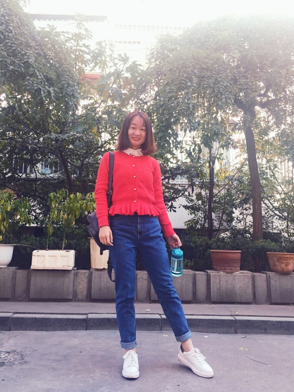 很喜欢这身,大一时喜欢的红毛衣大三才拥有。大四才有一个合适的搭配。这条mom jeans本来是又肥又长的,改短改瘦以后异常适合我。