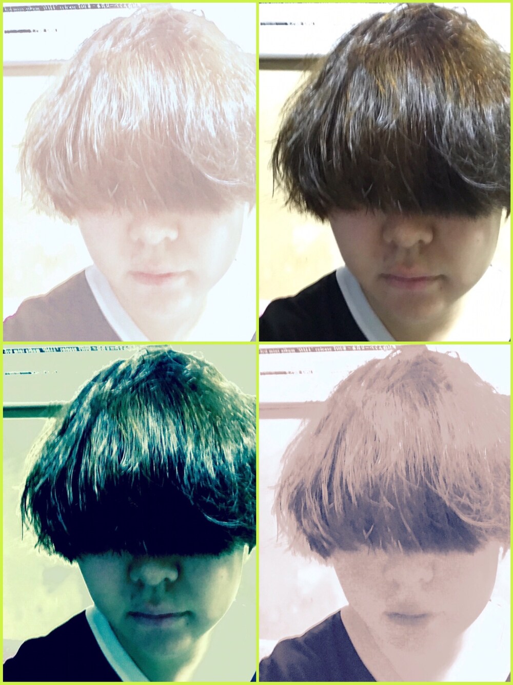 「キノコ!」言いながら自分で遊んでました パジャマ代わりにオーラルスポーツTです← 写真でもわかるように、結構髪の毛傷んでますね〜 染めすぎですね、うまく染まってないですけど、、、 右上:加工前 右下:エリンギ 左上:しいたけ(色的に) 左下:毒キノコ