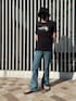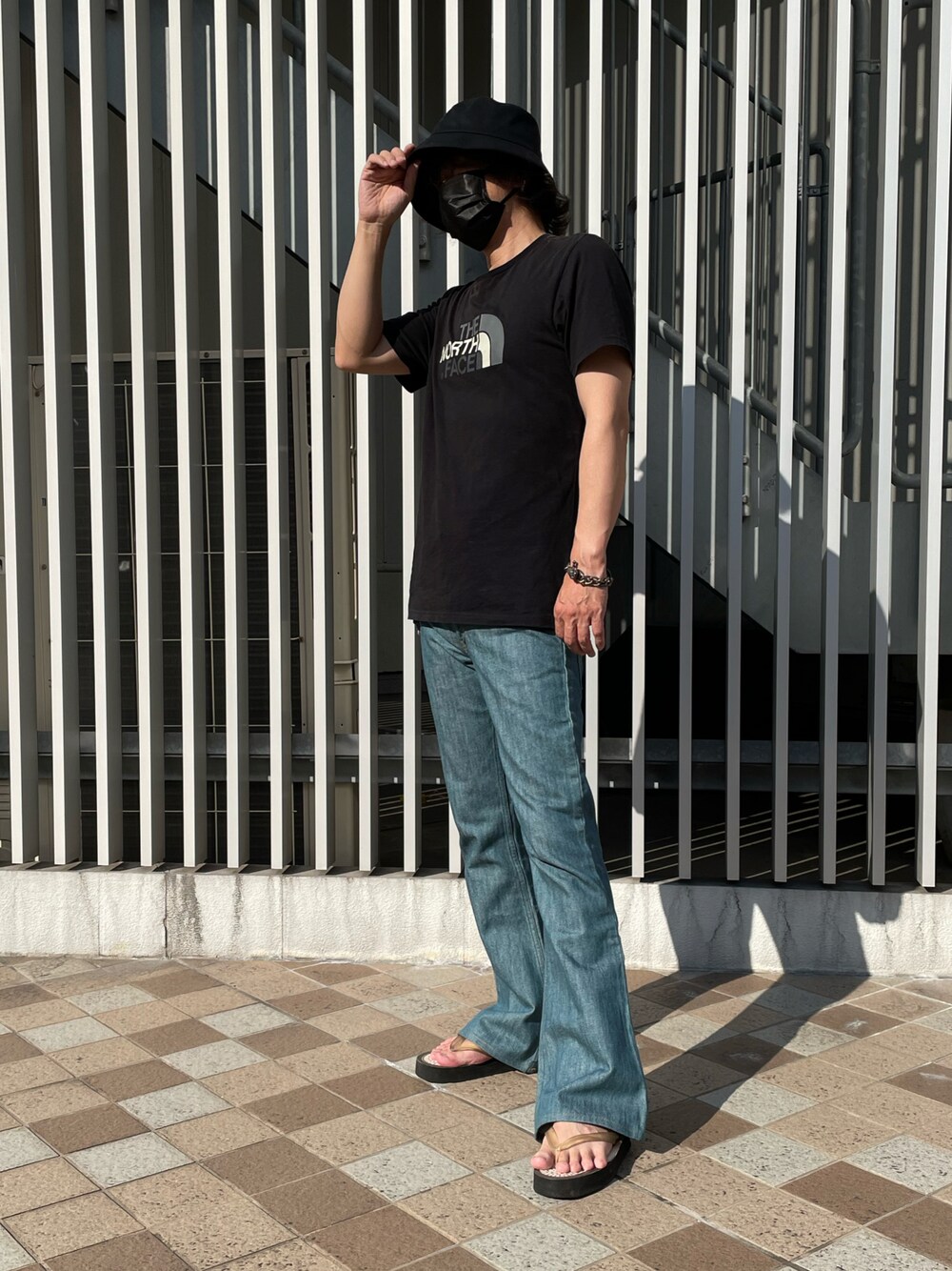 こんにちは。 アツい夏はlevi's 646 フレアパンツと ラバーソール柄の厚底サンダルで涼しく、 脚長スタイルで颯爽と。 上はTシャツでシンプルに、ハットと共に 黒をチョイスしてスッキリ締まった感じにしました。 ありがとうございました。