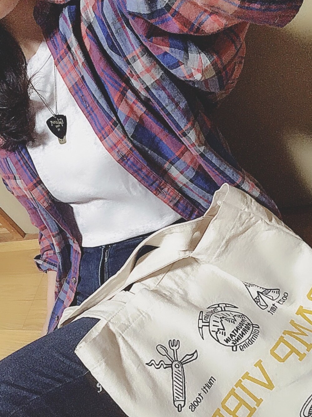 「ロックは聴くけどギターは弾けない」 1番のポイントは ギターのピックのネックレス!! 商品にならなかったギブソンのピックが使われていて、一点一点微妙に形が違うのだとか、、🤔 なかなかないデザインだったので一目惚れして、即買いしました😊 ネックレスを見た方に、ギター弾くの?って聞かれるのですが弾けないのです、、、笑 チェックシャツとデニムのコーディネートを女の子っぽく着こなすのは難しいですね、、、