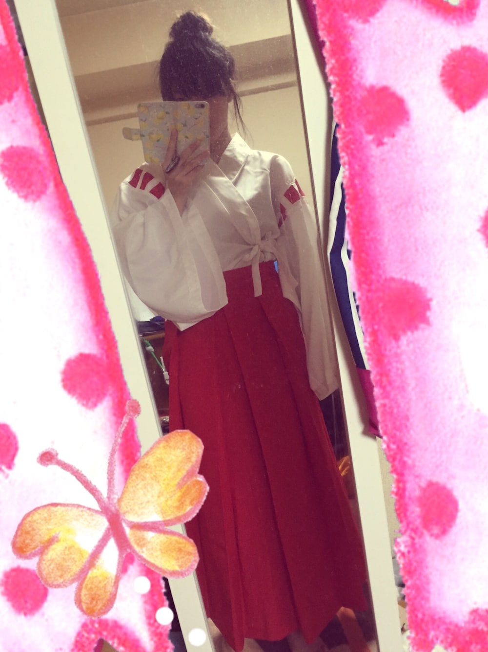 とあるイベントに参加するため、巫女の衣装をお借りしました(*´﹀`*)はじめて着たーっ♪ 仕事終わりに着たからお団子ヘアのままだけど( •̅_•̅ )