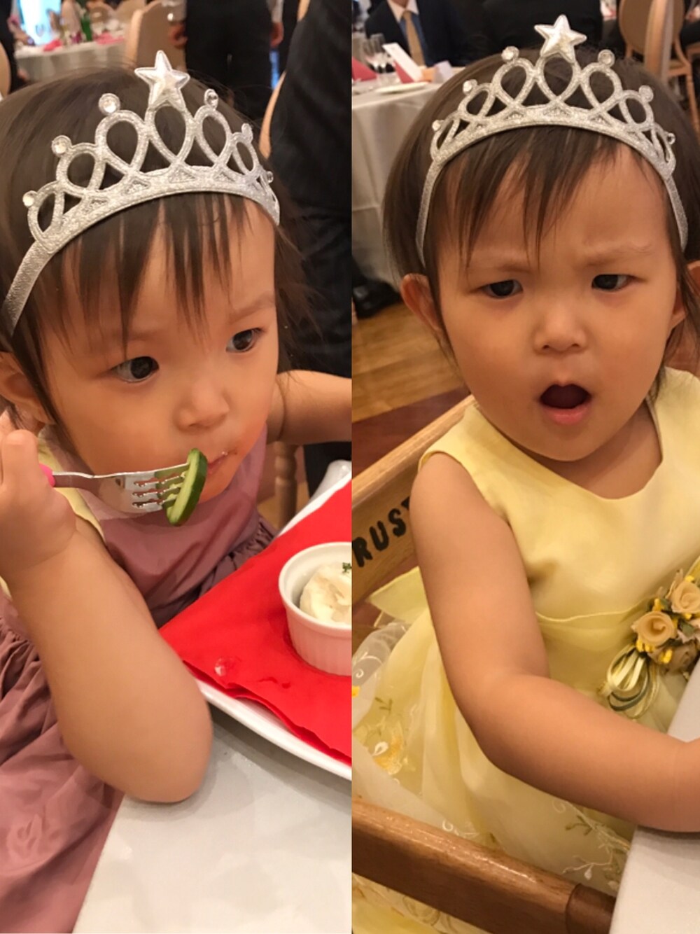 先日の結婚式におよばれされたときのひまりさんです。 最近「ハイチーズ」ってカメラ向けると、右の写真の顔をします…😅 2歳児も変顔するんですねぇ笑 親としてはかわいいお顔を残したいのですが… 親の心、子知らずですね😅